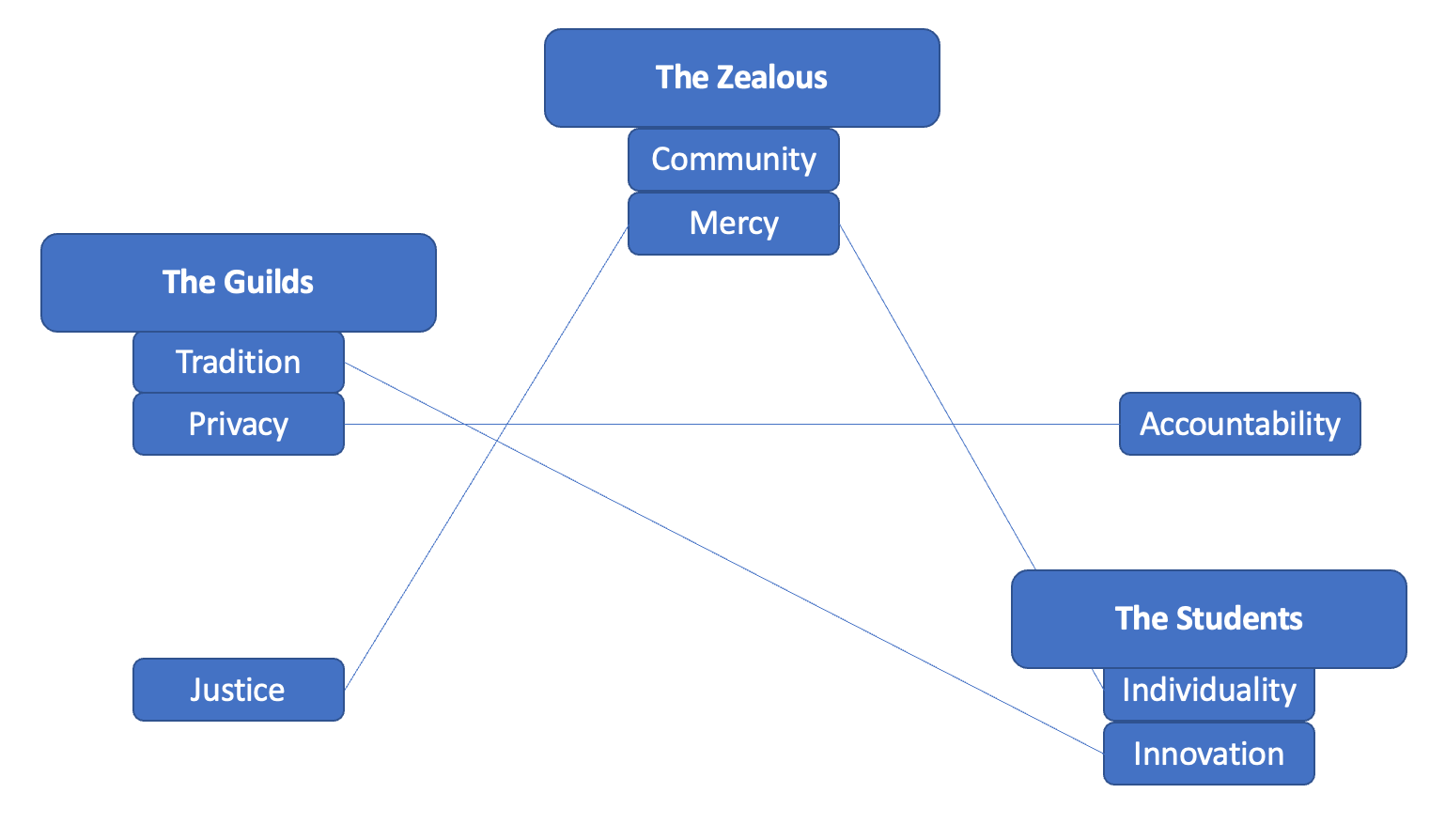Does it make sense how this is coming together? It means that the Zealous and the Guilds are potential allies, since they have no direct sources of conflict, but the Guilds also could align with whatever faction ends up being linked to justice--who the Zealous oppose. This serves as a natural balance of power, because if the Zealous make an alliance, there's now three natural enemies of that pairing. But if the three become too strong, the internal conflict within that group of three can fracture and break up the alliance.