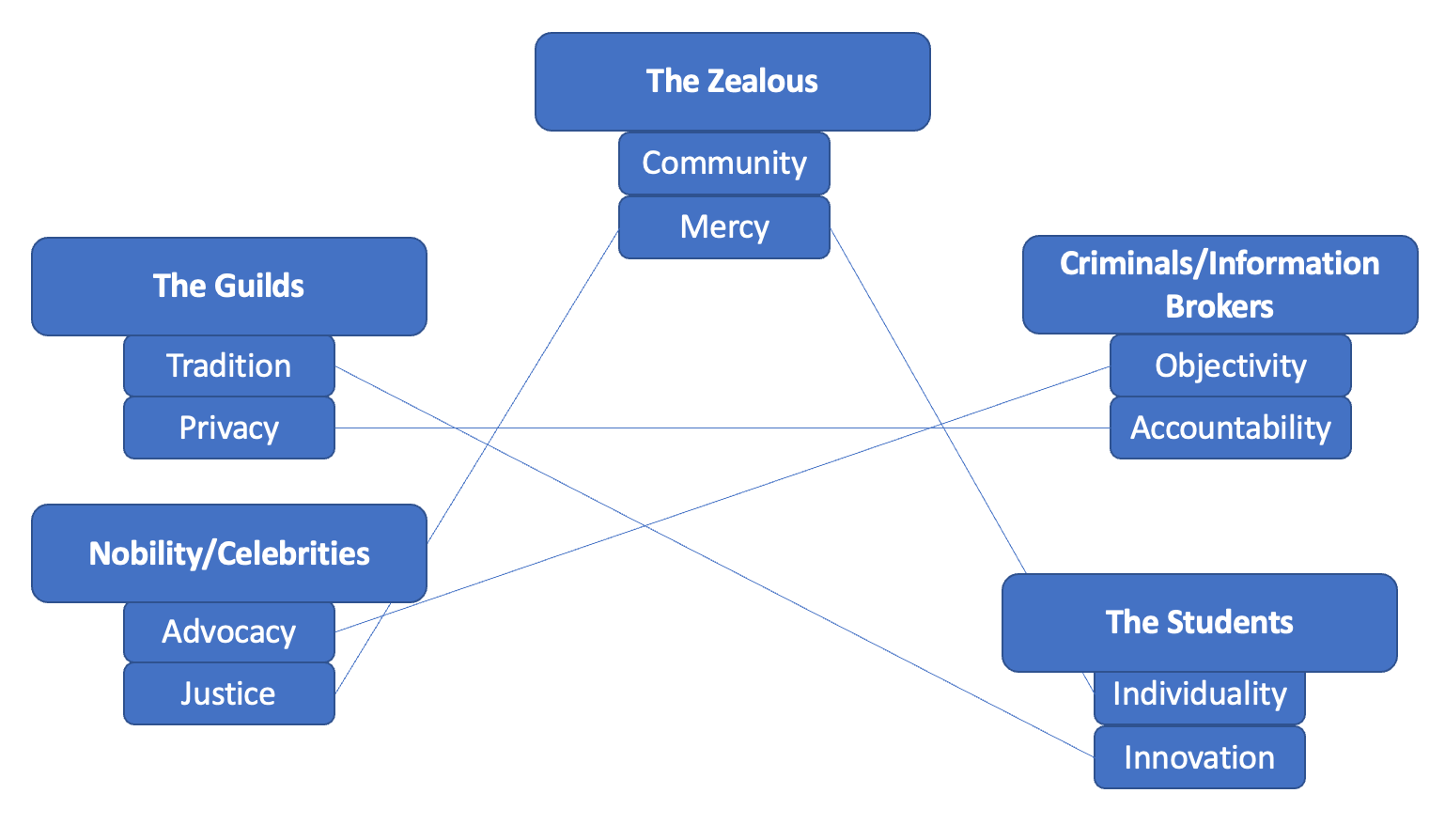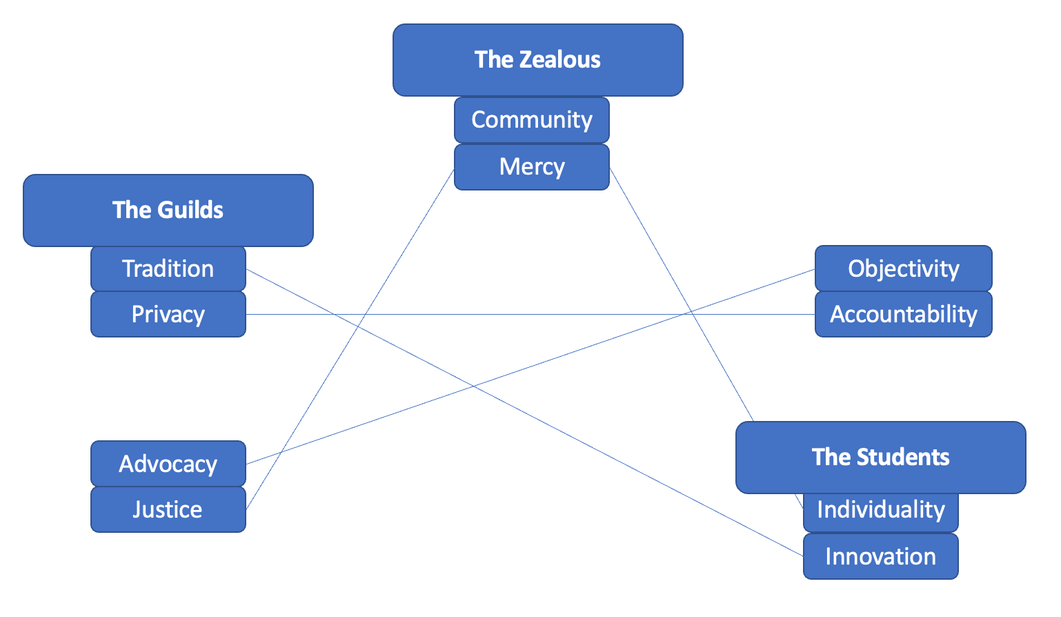 Ok, so we now need a group that stands for accountability, opposing the desire for privacy from the guilds. And, by process of elimination, that final conflict axis needs to be objectivity vs advocacy. I think accountability and objectivity align the best here, better than accountability and advocacy. We've also created a situation where "accountability" and "justice" are not in the same faction, which I think is... interesting.
