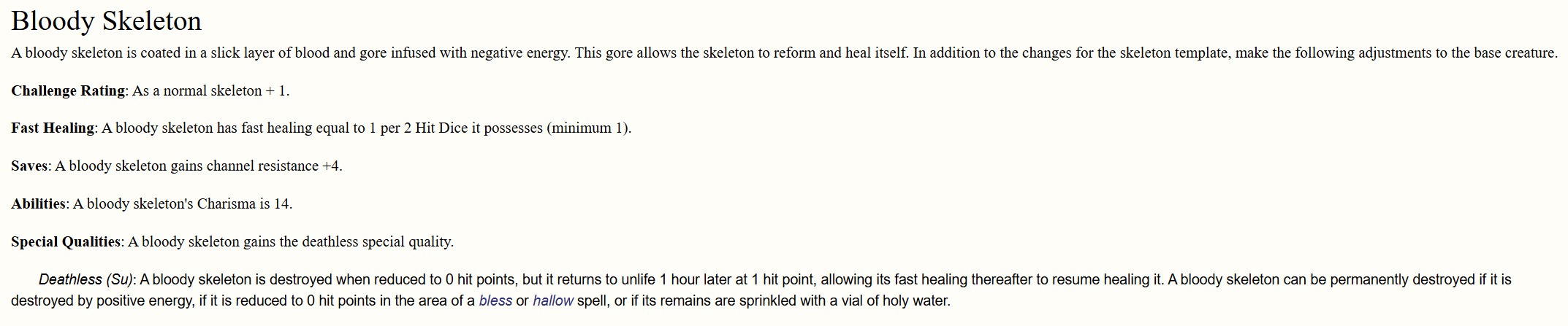 I'll talk more about this next week when I discuss adapting D&D Zombies specifically, but I'll start by saying that Pathfinder's Bloody Skeletons are a good start on how to really make a mundane sort of undead feel genuinely scary and unkillable--as a shambling zombie should be.
